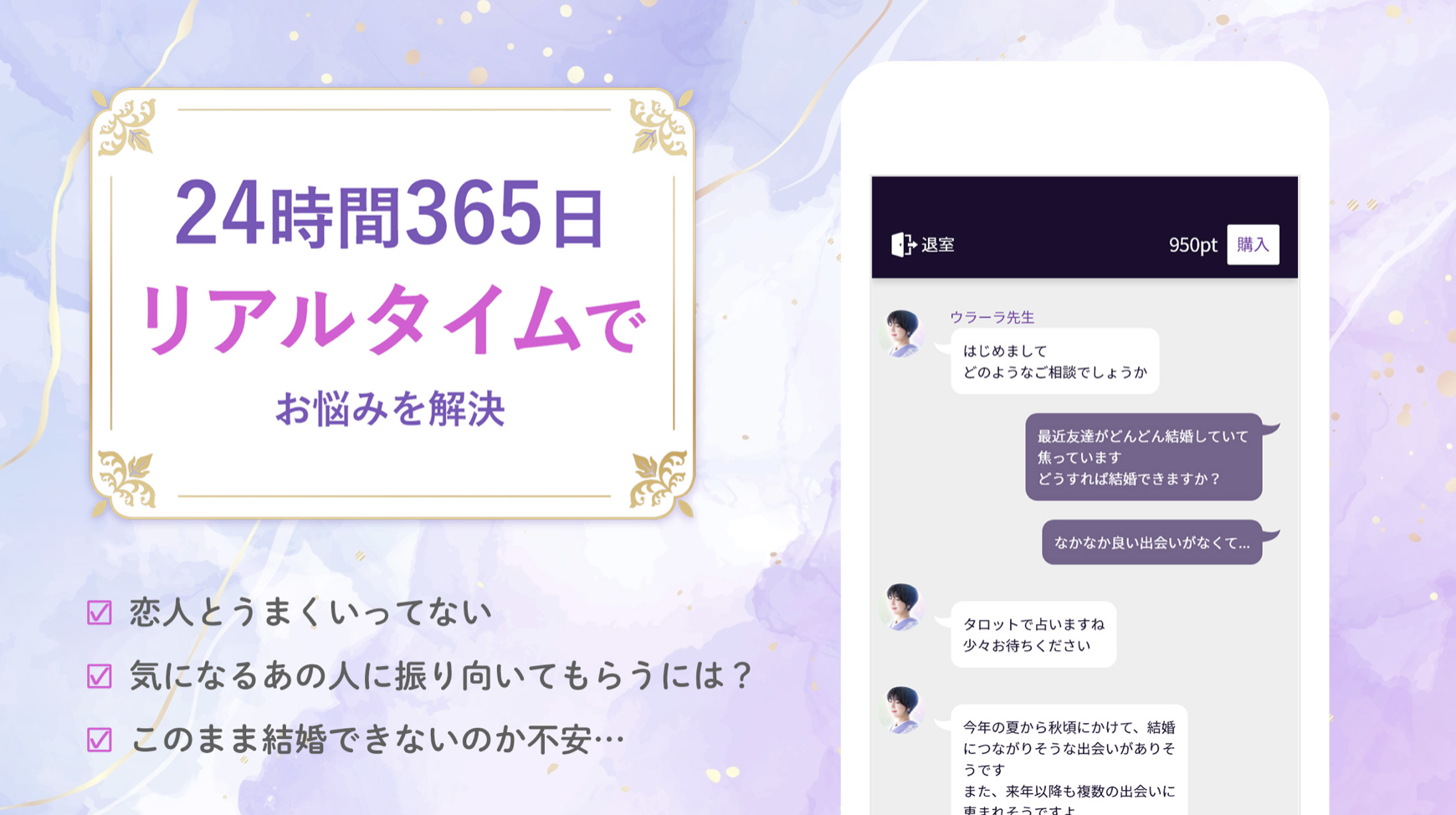 『ウラーラ』は、チャット・電話・メールを通じて、プロの占い師に直接占ってもらえるアプリ。